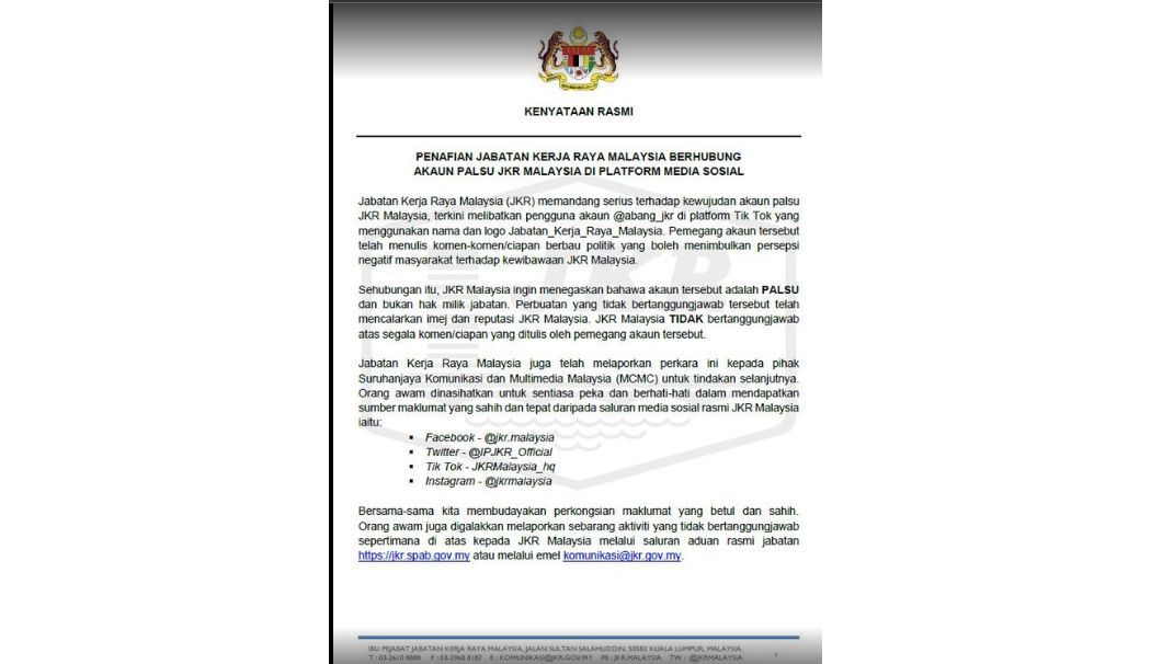 QuickCheck: Is someone impersonating the Public Works Department on TikTok?2023-01-17RECENTLY, an account with the username @abang_jkr has been created on the social media platform TikTok. Read full storySource : https://www.thestar.com.my/news/true-or-not/2023/01/18/quickcheck-is-someone-impersonating-the-public-works-department-on-tiktokShareFacebookTwitterPinterestWhatsApp Previous articleEight hawker stalls near Penang's City Stadium damaged in blazeNext articleNo highway tolls on Jan 20-21 during CNY, says PM Latest ArticlesPAS still wants to lead PN, says Takiyuddin 2026-02-16 Perikatan to decide new chairman at Extraordinary Supreme Council Meeting on Feb 22 2026-02-16 Perikatan to decide new chairman at Extraordinary Supreme Council Meeting on Feb 22 2026-02-16 Slow moving traffic reported on major expressways nationwide as of noon 2026-02-16 Slow moving traffic reported on major expressways nationwide as of noon 2026-02-16 Mother, daughter face sombre Chinese New Year after fire destroys flat 2026-02-16