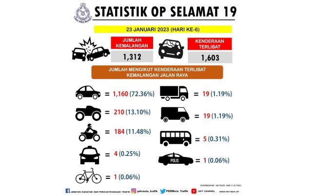 Ops Selamat 19: Traffic accidents continue to breach 1,000 mark on sixth day2023-01-24PETALING JAYA: Accident cases continue to breach the 1,000 mark on the sixth day of Ops Selamat 19. Read full storySource : https://www.thestar.com.my/news/nation/2023/01/24/ops-selamat-19-traffic-accidents-continue-to-breach-1000-mark-on-sixth-dayShareFacebookTwitterPinterestWhatsApp Previous articleRevive suspended CIQS project in Kalabakan, Shafie urges PutrajayaNext articleFloods: 1,093 victims in Johor evacuated as of 4pm Latest ArticlesTrump ally ties up with Russia's Novatek on natural gas in Alaska, NYT reports 2026-02-20 Plight of two families in Banting fire draws Anwar's attention 2026-02-20 Plight of two families in Banting fire draws Anwar's attention 2026-02-20 Shah Alam's first female mayor vows swift, decisive leadership 2026-02-20 S'pore PM Lawrence Wong arrives in Malaysia for special visit 2026-02-20 Over 400 flee homes as floods hit Kota Marudu, Pitas 2026-02-20