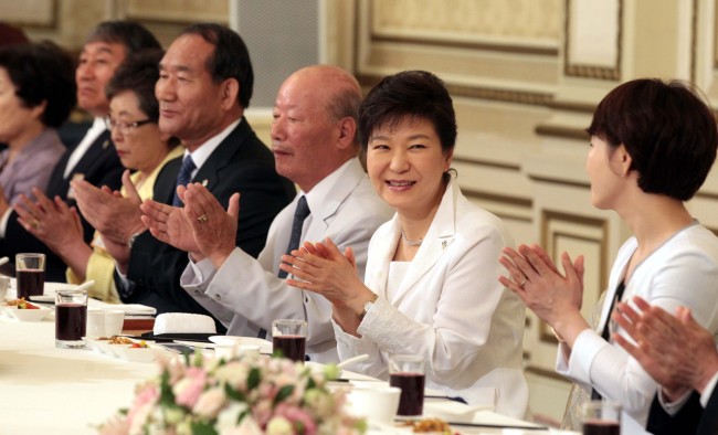 President Park Geun-hye attends a luncheon with decorated patriots and bereaved families at Cheong Wa Dae in Seoul on Thursday. (Park Hyun-koo/The Korea Herald)