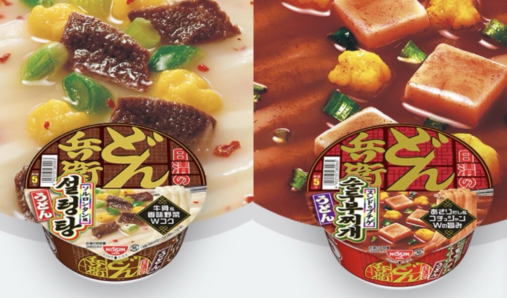 Korean instant noodles such as seolleongtang and soft tofu stew have been introduced in Japan, while overseas markets are selling instant noodles that are reminiscent of Korea’s Shin Ramen and Hot Chicken Noodles. According to the industry, Nissin Food launched Seolleongtang-flavored Udon and Soft Tofu Stew-flavored Udon on Nov. 20 last year. The products, which were launched in the form of cup noodles, have the words “Seolleongtang” and “soft bean curd jjigae” written in Korean, respectively. In May the same year, Nissin Food launched cup noodles with the flavors of seafood jjamppong Udon and seasoned chicken-flavored stir-fried udon. Again, each package is written in Korean. Nissin Food is the first company in the world to make instant noodles and cup noodles. It caused controversy by launching a ramen that looks like a copy of Samyang Food’s “Carbo Hot Chicken Nissin Ramen.” The company, dubbed the origin of ramen, has launched a product referring to the latecomer Korean company’s ramen, followed by a series of ramen noodles inspired by Korean cuisine. Nissin Food is also selling Korean instant noodles in overseas markets. Notably, the products have similar shape and taste to those of popular Korean instant noodles. The Thai branch of Nissin Food is selling “Spicy Ramen” that claims Korean spicy taste. The black 辢 written on the red package reminds people of Korea’s Shin Ramen. Along with the explanation of “Korean spicy taste” in Korean, the Chinese character “辛” (spicy) is also written like a wrapping paper of Shin Ramen.