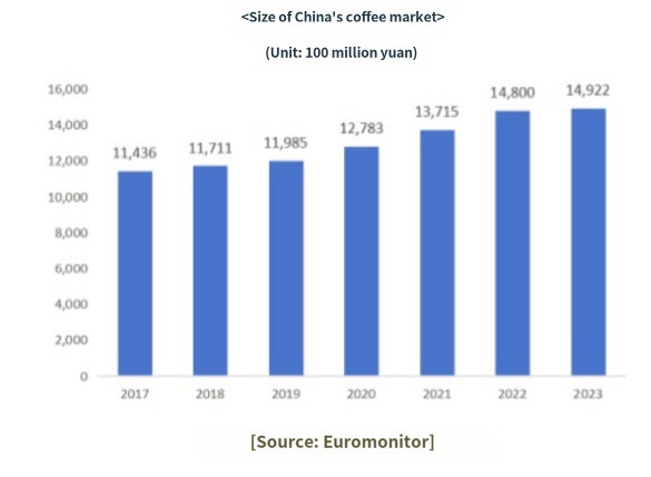 According to a report titled “Growth of Chinese Coffee Market and Changing Consumer Taste” recently released by the Korea Trade-Investment Promotion Agency (KOTRA), coffee has become firmly established in China as a daily habit, not a favorite food. According to the 2024 China Urban Coffee Development Report, the annual coffee consumption per person in China increased from nine cups in 2016 to 16.74 cups last year. The number of café stores is also rapidly increasing. The number of café stores in China now stands at around 132,800, an increase of more than 30,000 in two years. According to market researcher Euromonitor, the size of the Chinese coffee market reached 14.922 billion yuan (W2.8 trillion) in 2023.