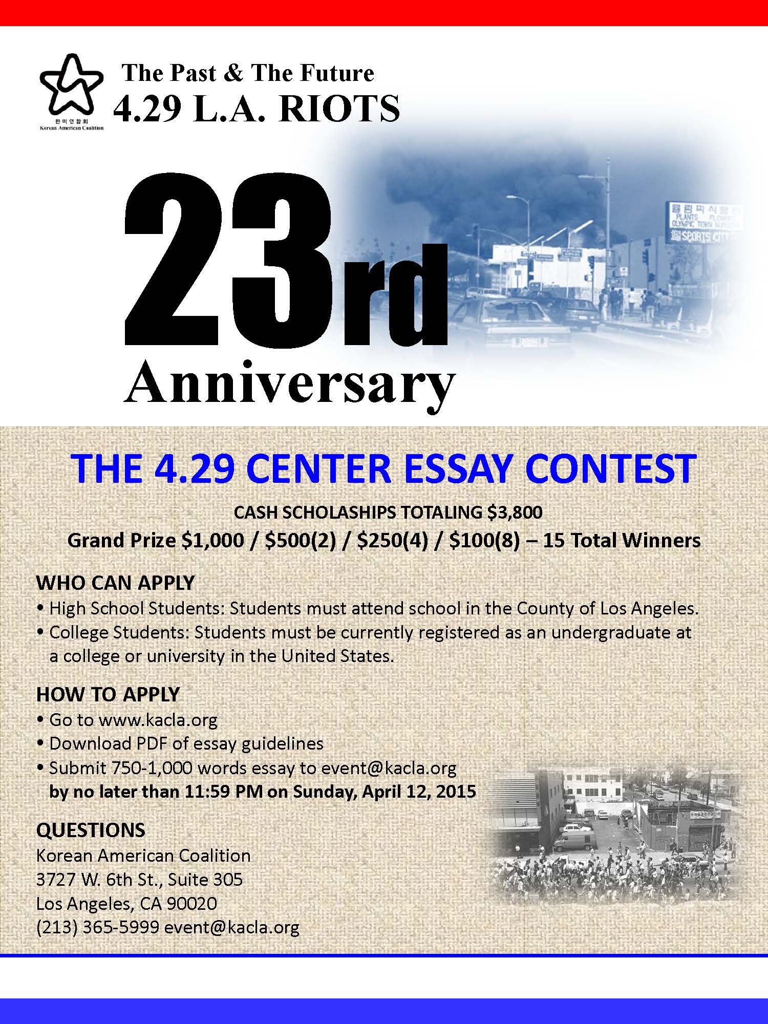 With this essay contest, KAC offers an opportunity for a generation of young Angelenos to earn cash scholarships while gaining deeper insight on an event in contemporary history that shaped L.A.’s communities. This is also a chance for students to learn how their community has been shaped by their understanding of the past, and will be shaped by their participating in the future.