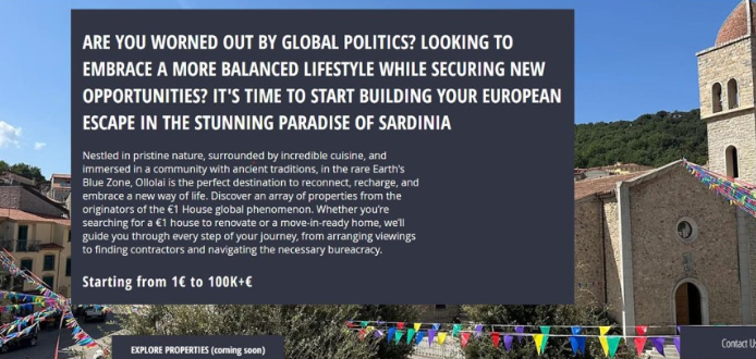 On the website, the English phrase “Are you tired of international politics? Do you seek a balanced life while ensuring new opportunities? It’s time to start your journey from Sardinia’s paradise to Europe.”