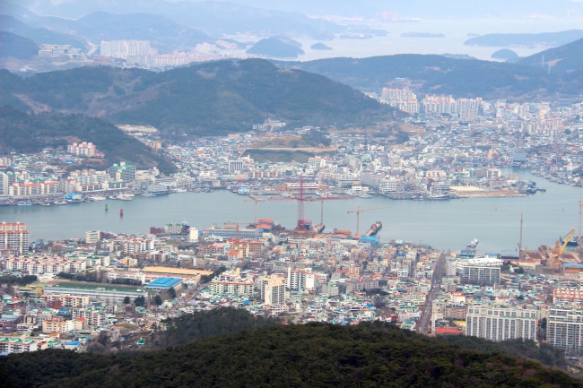 A view of the Tongyeong port-side cityscape from the peak of Mireuksan Mountain