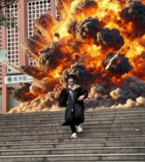 The Hong Kong daily South Morning Post (SCMP) reported that Chinese graduates, who are facing an uncertain future, are sharing laughter with “self-deprecating graduation photos.” Photos shared online show the graduate holding up his head, his soul escaping from his body, and escaping from an exploding school.