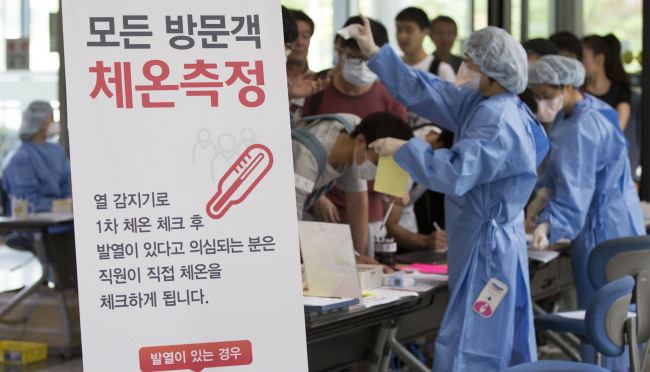 | Visitors are checked for their body temperature by health care workers at Samsung Medical Center, one of the MERS-affected hospitals that resumed normal services on Monday. Yonhap |