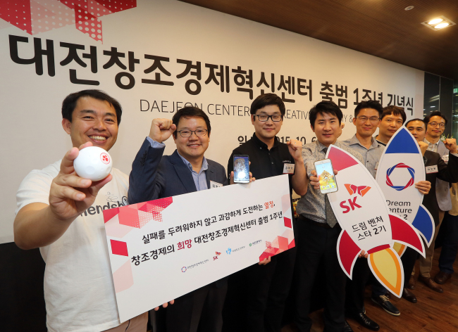 | Venture firms participating in SK’s Dream Venture Star program at the Daejeon Creative Economy Innovation Center, led by SK Group and the Korean government, celebrate the center’s one-year anniversary on Oct. 6. (SK Group) |