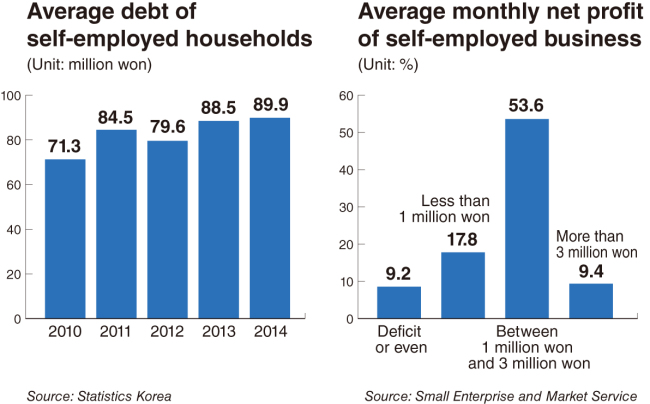 The average debt of self-employed households continued to climb from 79.6 million won in 2012 to 88.5 million won in 2013 and 89.9 million won in 2014, according to figures from the state statistical office. Data released by the Bank of Korea on Sunday showed bank loans extended to self-employed people increased by 23.3 trillion won in the first nine months of the year to 232.6 trillion won at the end of September. The sharp rise in loans, which results partly from the central bank’s measure to keep interest rates at a record low level for a year, suggests many unprofitable self-employed businesses keep themselves afloat by borrowing money amid a prolonged economic slump.