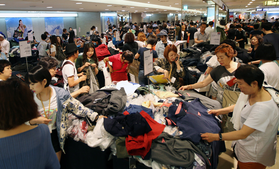| Shoppers shift through sales items at a Lotte Department Store(Yonhap) |