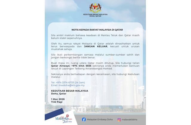 Source : https://www.thestar.com.my/news/nation/2026/03/01/malaysians-in-qatar-advised-to-remain-vigilant-avoid-going-out-says-embassy
