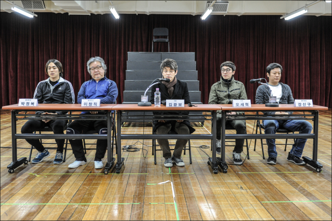 | (From left) Actors Park Jung-bok, Lee Chang-gik, director Kim Gwang-bo, writer Oh Se-hyuk and actor Kang Shin-gu speak during a press conference for the upcoming play “Henry IV” at the Sejong Center in Seoul on Wednesday. (Sejong Center) |