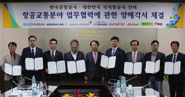 | Kwon Yong-bok, head of aviation policy at the Ministry of Land, Infrastructure and Transport (center) poses with representatives from airlines after an MOU for cooperation between the airlines and the Korea Airports Corporation was signed at KAC headquarters in Seoul on Wednesday. (Yonhap) |