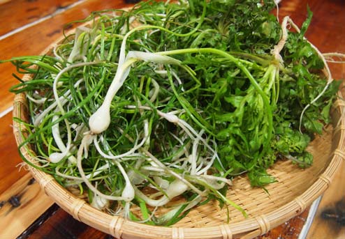 The other day as I was walking out of the gate of my house I came across my next-door neighbor holding a basket filled with green vegetables. When I figured out what she was carrying I was surprised because it was naengi (Capsella bursapastoris, or shepherd’s purse). This plant suddenly reminded me of the fact that spring is just around the corner. In spring on Jeju — and especially in my village in Seogwipo — there are lots of edible greens like naengi and dallae (wild chives, Allium monanthum) that sprout on farms, in the hills, and even near the coast.