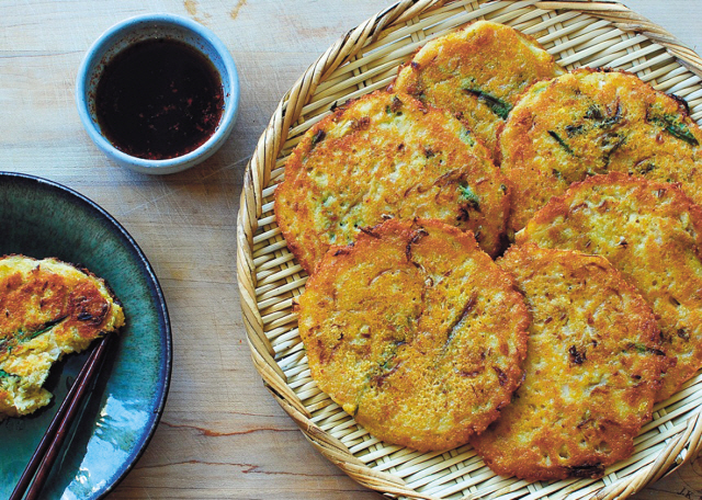 5. Heat 1 tablespoon of oil in a non-stick pan over medium to medium-high heat. Ladle the mixture into the pan and spread it evenly into a thin round shape. Cook until the bottom is golden brown (2-3 minutes), and turn it over, adding more oil. Press it down with a spatula, and cook for another 2-3 minutes. Repeat the process with the rest of the mixture. Serve hot off the pan with a dipping sauce.