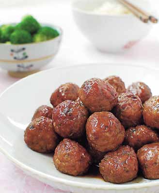 Combine all the meatball ingredients well by hand until evenly blended. Shape the mixture into about 3-centimeter balls. Dredge the meatballs in the cornstarch or flour to lightly coat. Heat a tablespoon of oil in a pan over medium heat. Add half of the meatballs to the pan. Turning as necessary, fry until all sides are golden brown but not cooked through, 5-7 minutes. The meatballs will finish cooking in the sauce. Remove from the pan and repeat with the remaining meatballs. Add all the sauce ingredients to another pan. Boil over medium heat until the sauce is slightly thickened, about 3-4 minutes. Add the meatballs to the sauce and simmer until the sauce becomes a thick glaze, turning to coat evenly, about 5 minutes. Sprinkle with the optional garnish. Serve warm with your choice of vegetables.